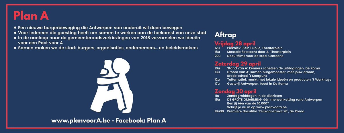 Plan A is een Antwerpse beweging van geëngageerde burgers en organisaties die samen met alle mede-Antwerpenaren op zoek willen naar antwoorden op de vele uitdagingen waar de stad voor staat. In de aanloop naar de gemeenteraadsverkiezingen van 2018 maken ze een pact dat ze niet alleen willen zien terugkomen in verkiezingsprogramma’s, maar ook in het daadwerkelijke bestuursakkoord. Ze geloven namelijk in democratie van onderuit. Volgens woordvoerder Sarah El Massaoudi: “de tijd dat we één keer om de zoveel jaar gingen stemmen en vervolgens carte blanche gaven aan politici, is definitief voorbij.”